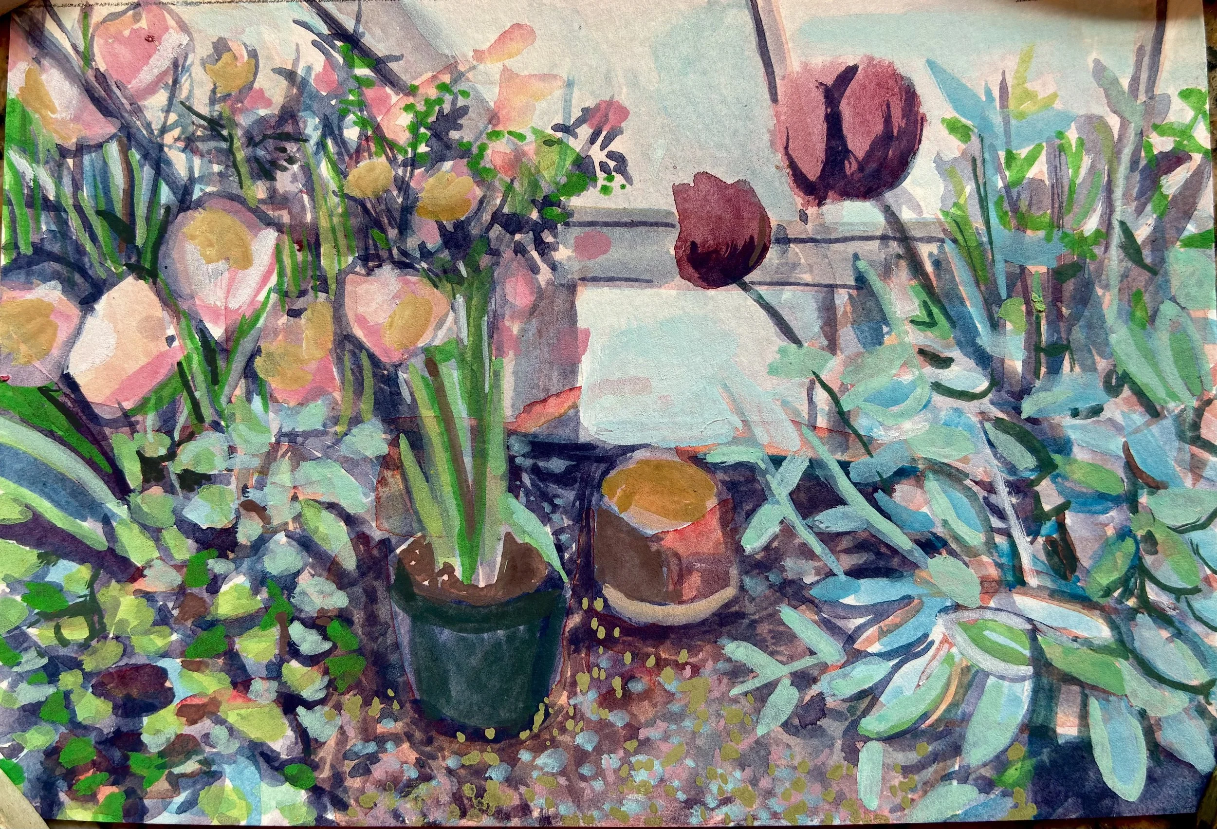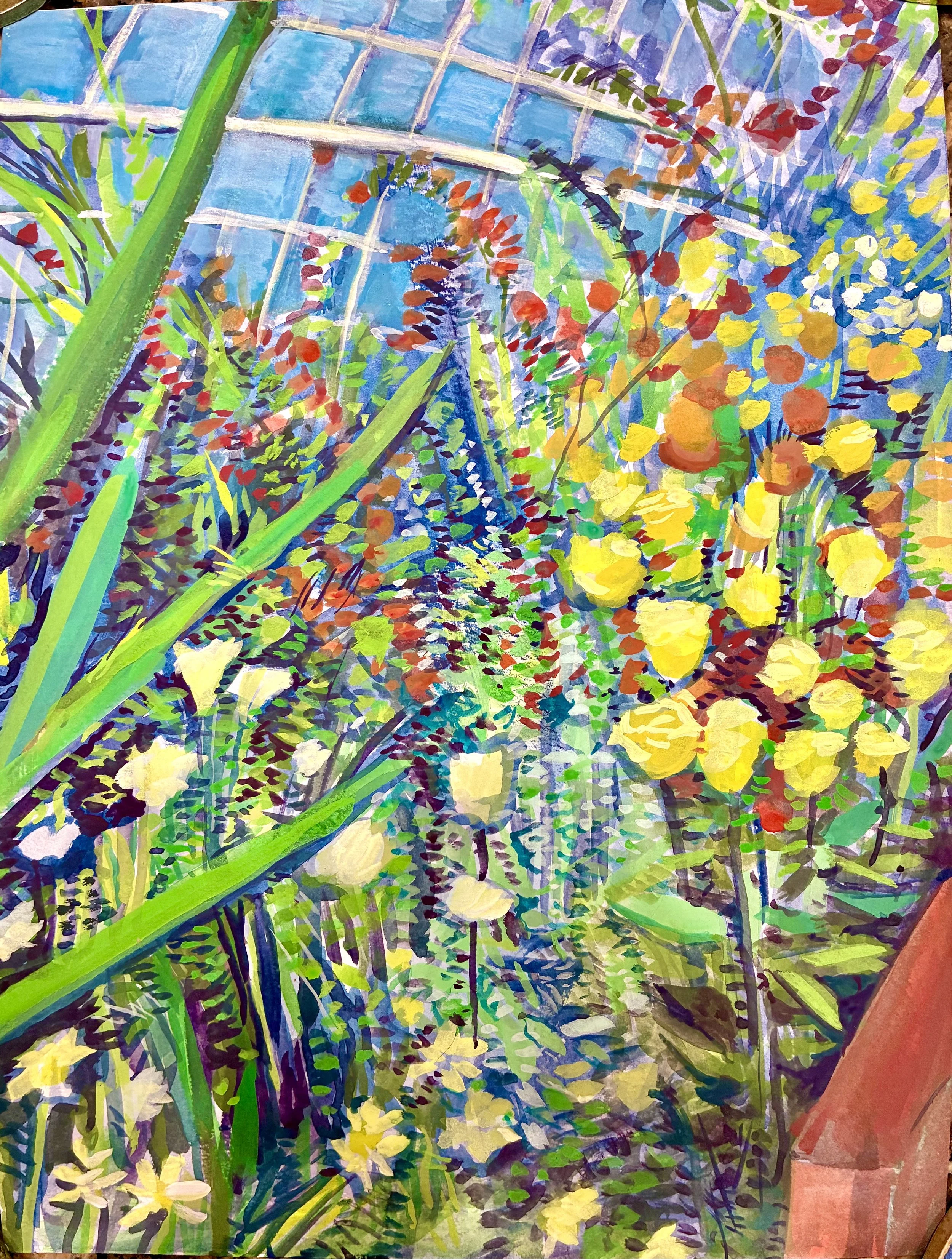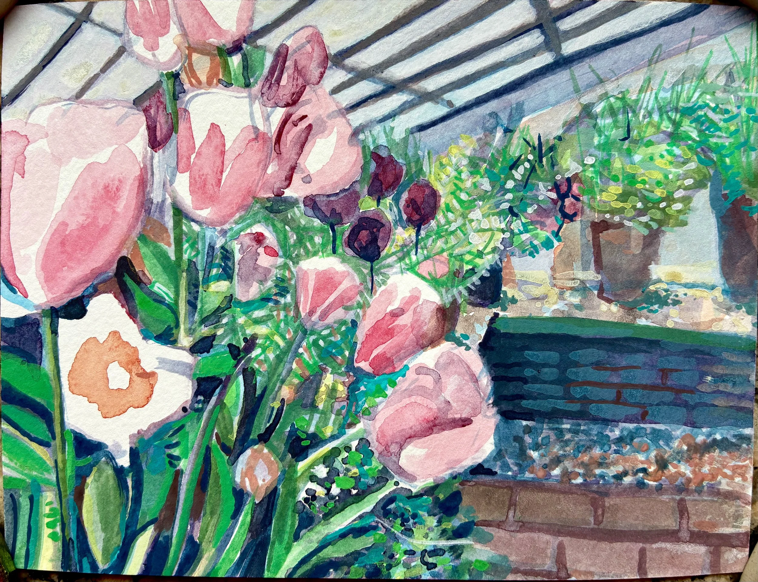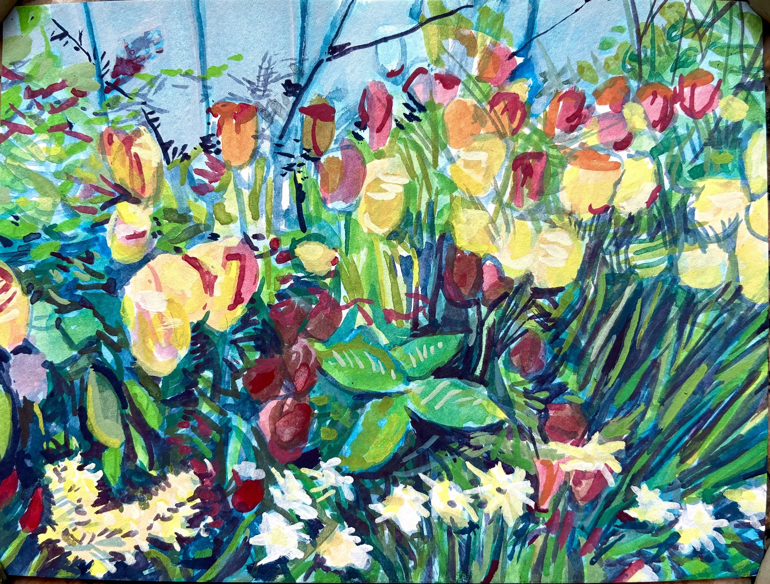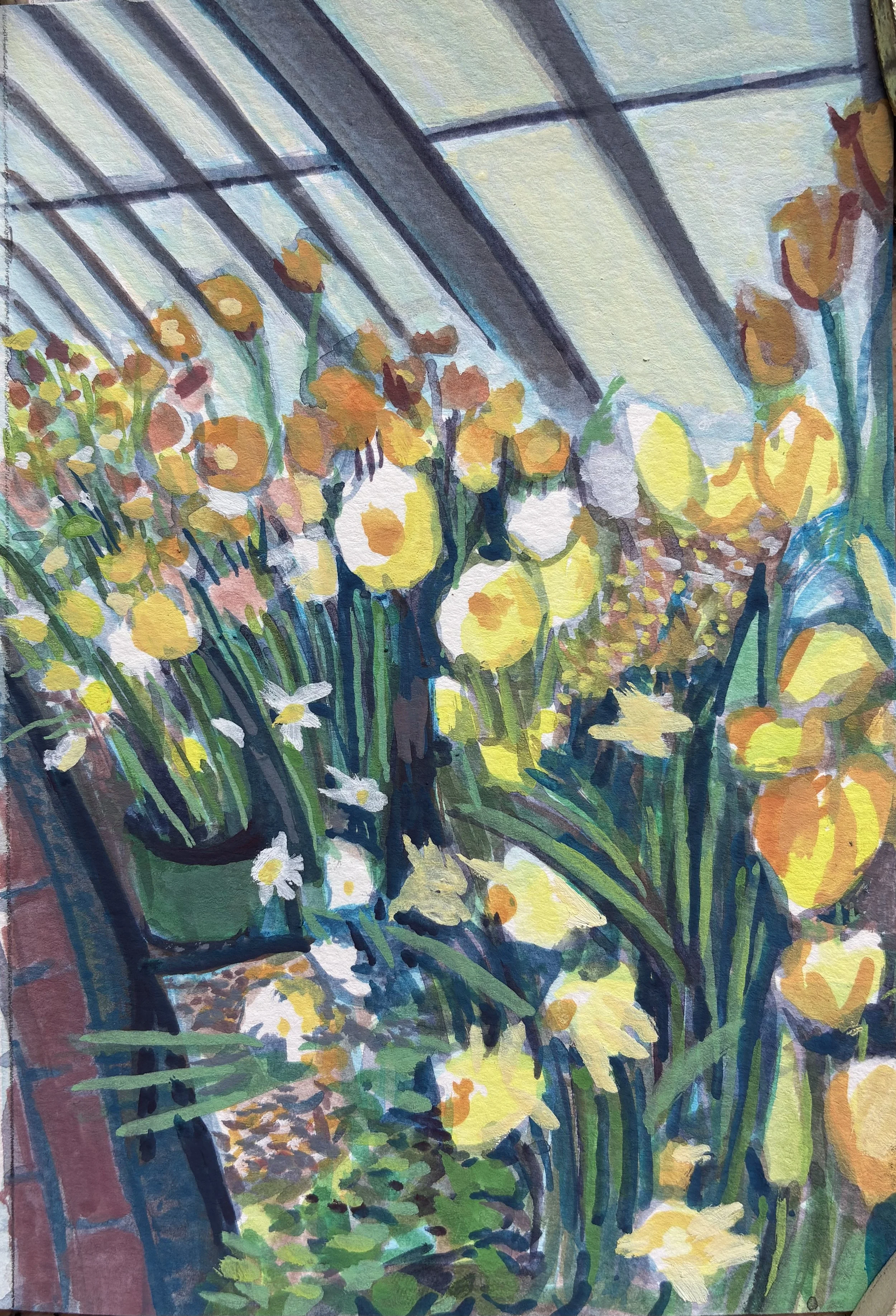 Gouache paintings of the Mount Holyoke College Botanical Garden Bulb Show on paper. 9×12in each. March 2026.