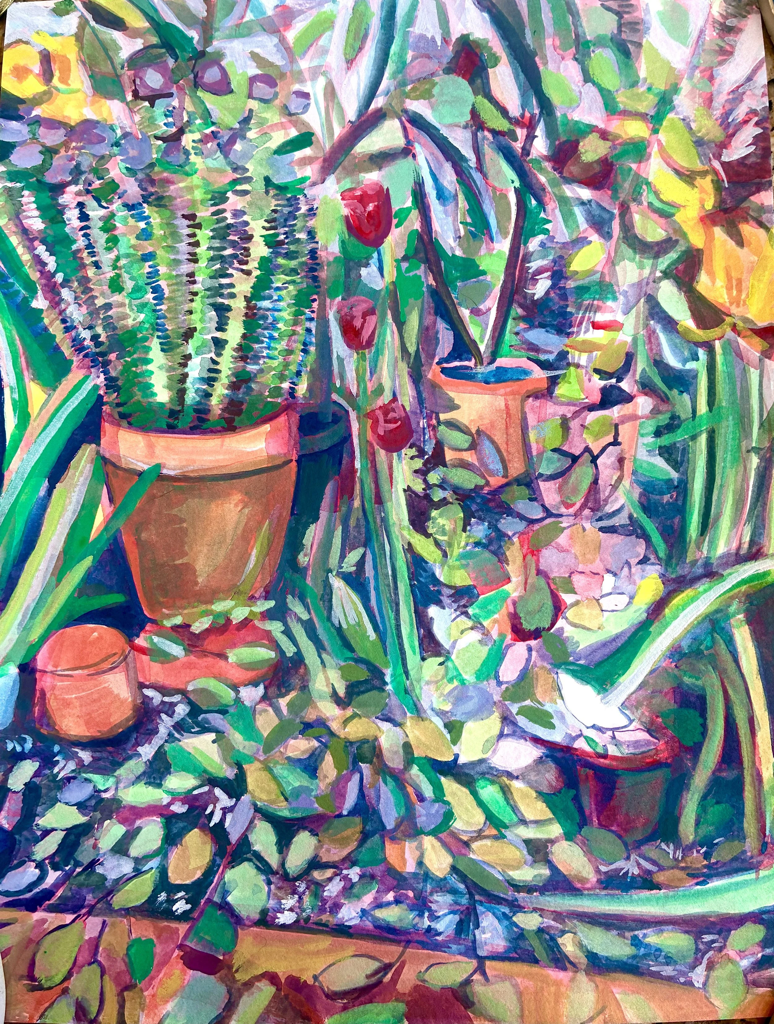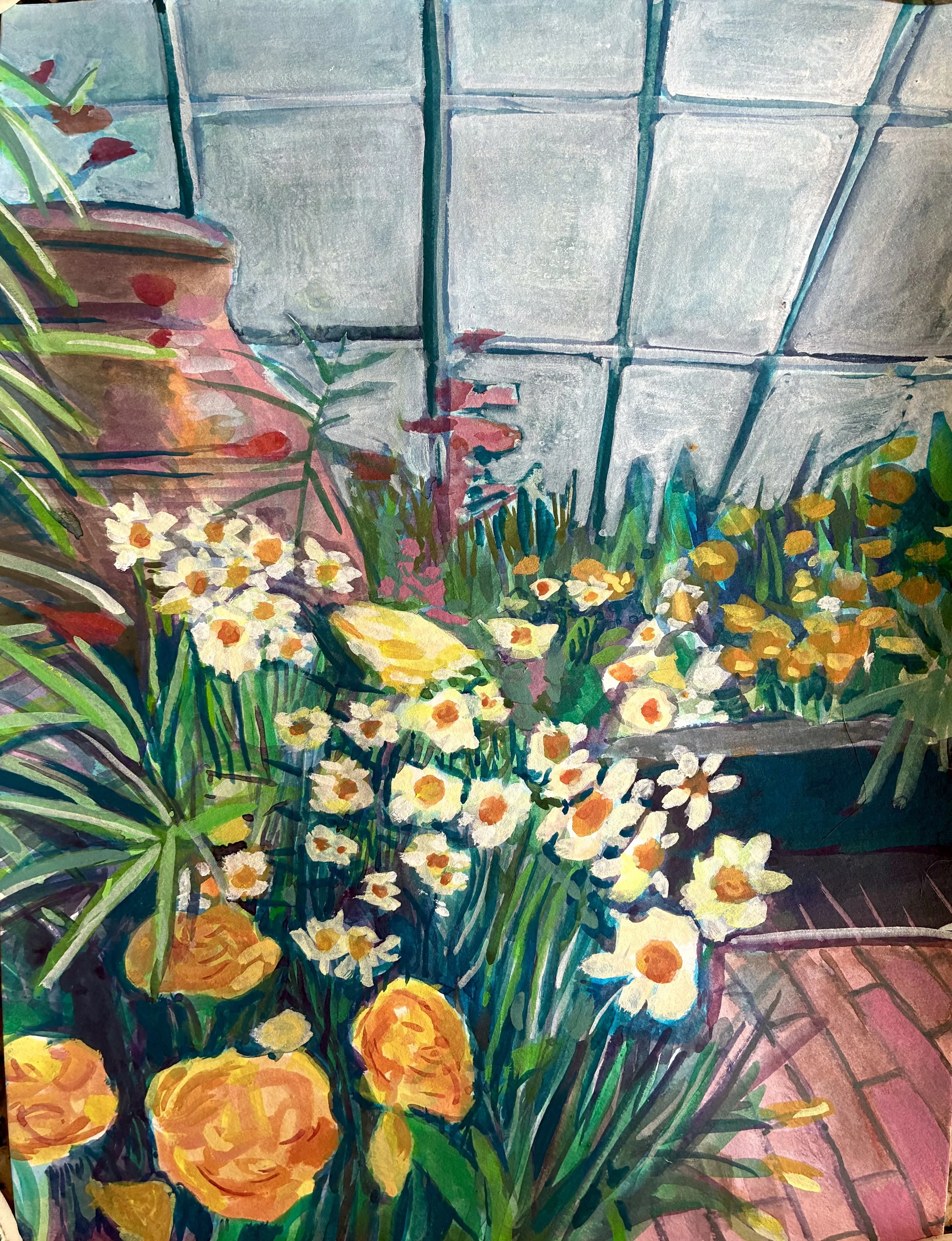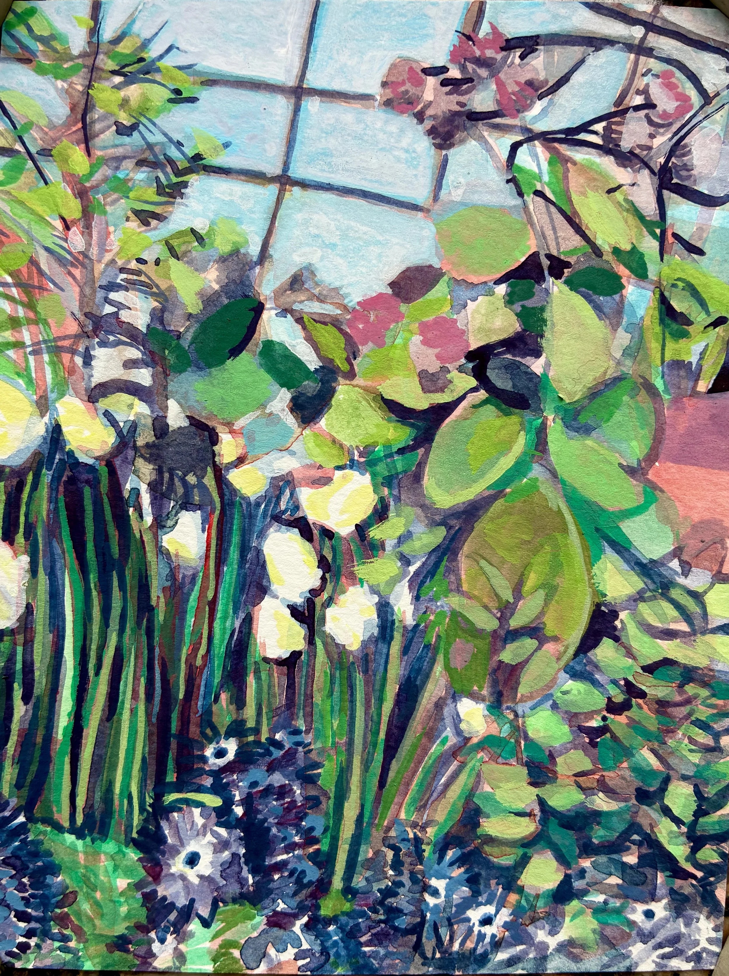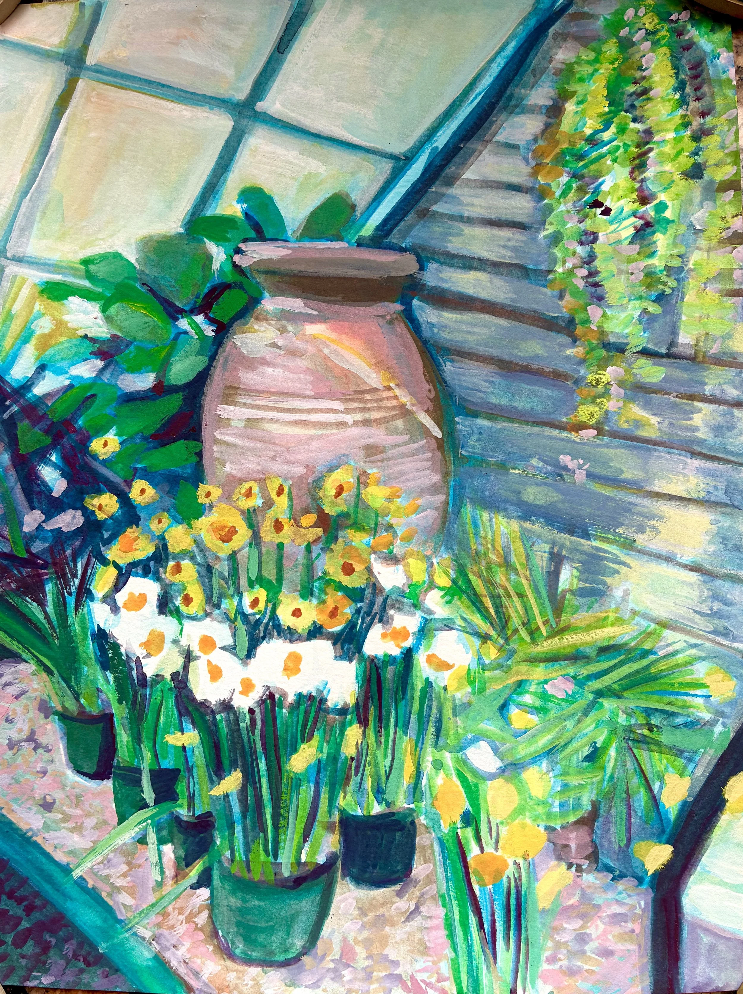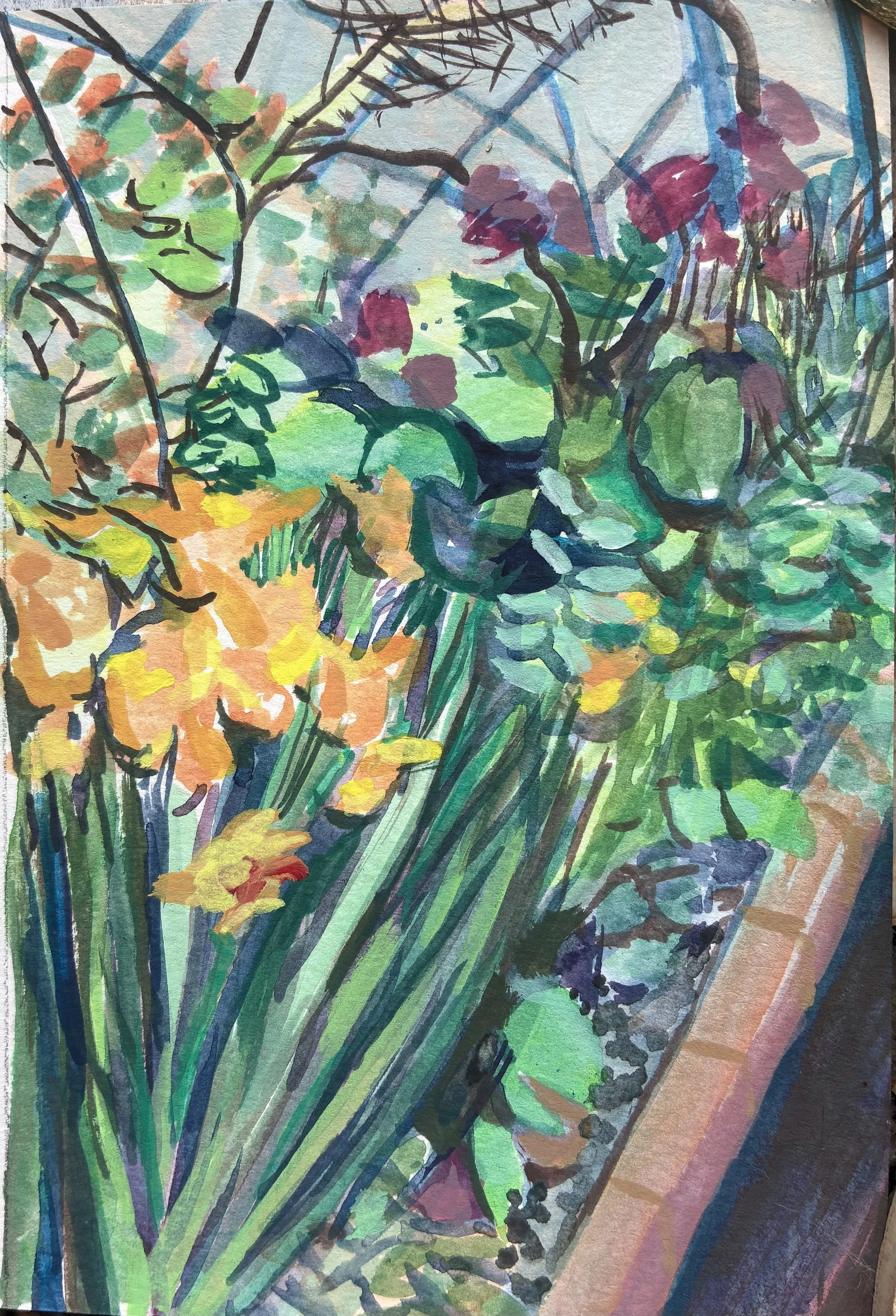 Gouache paintings of the Mount Holyoke College Botanical Garden Bulb Show on paper. 9×12in each. March 2026.