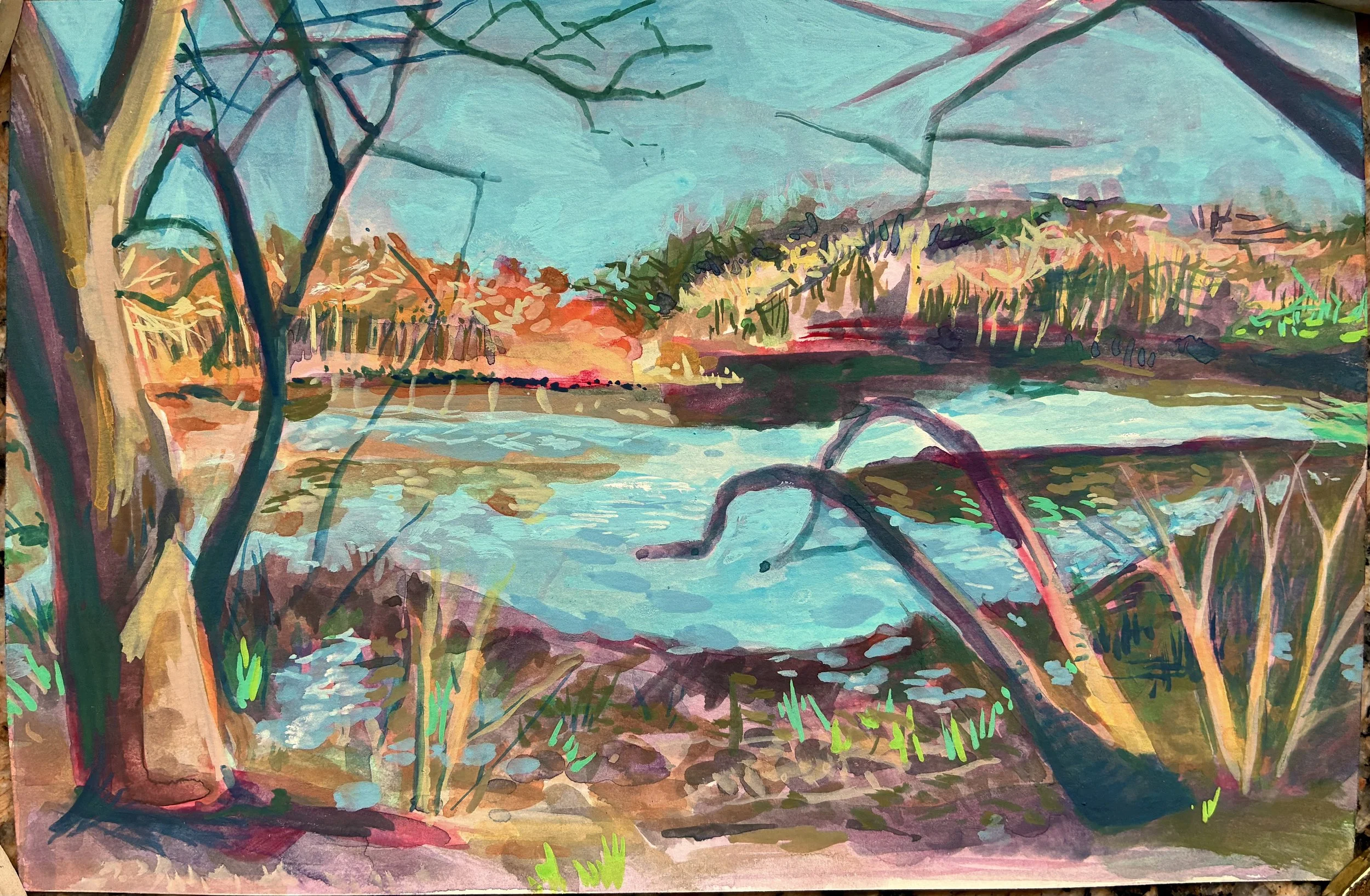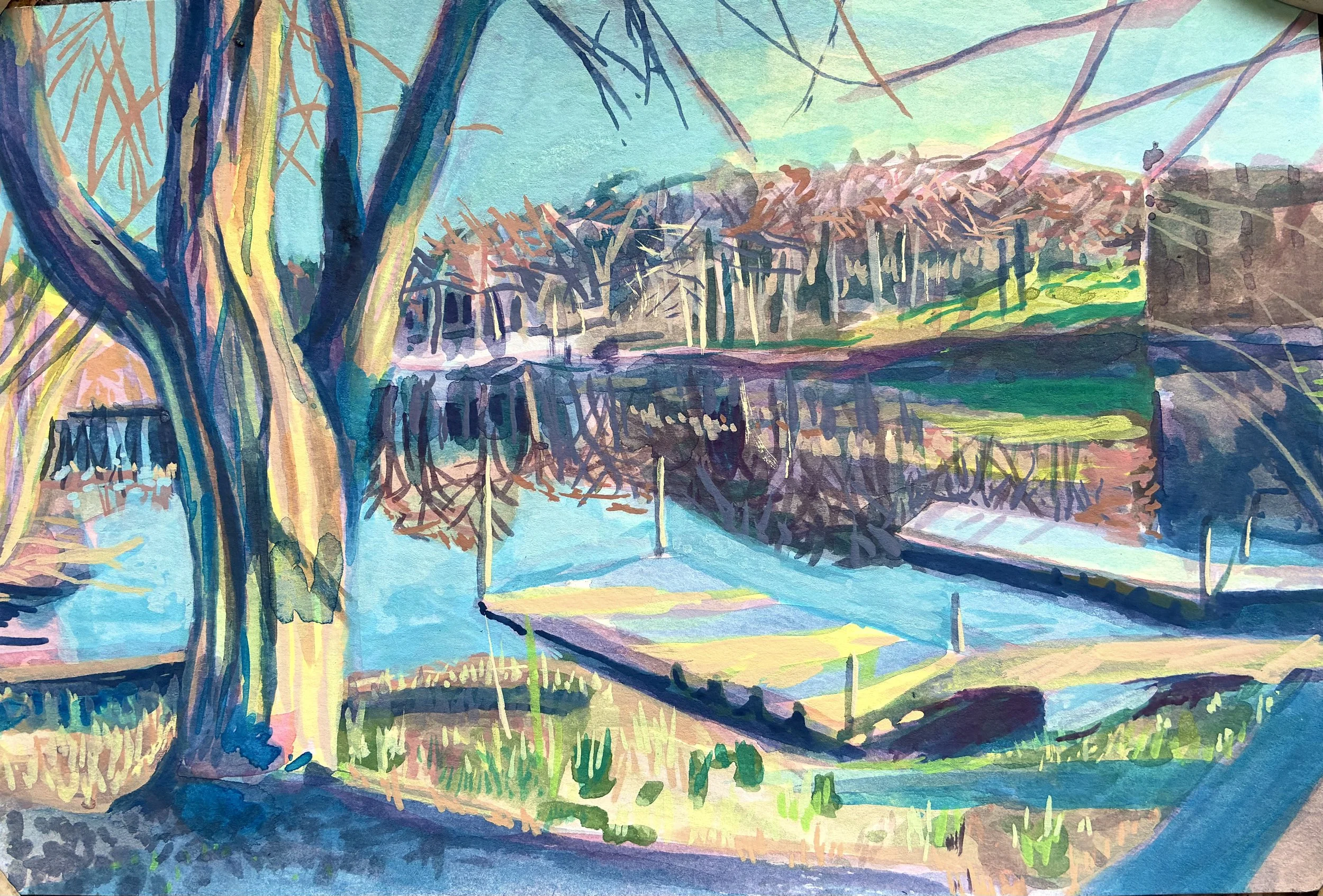 Gouache paintings of the Upper Lake at Mount Holyoke College on paper. 6×9inin each. April 2026.