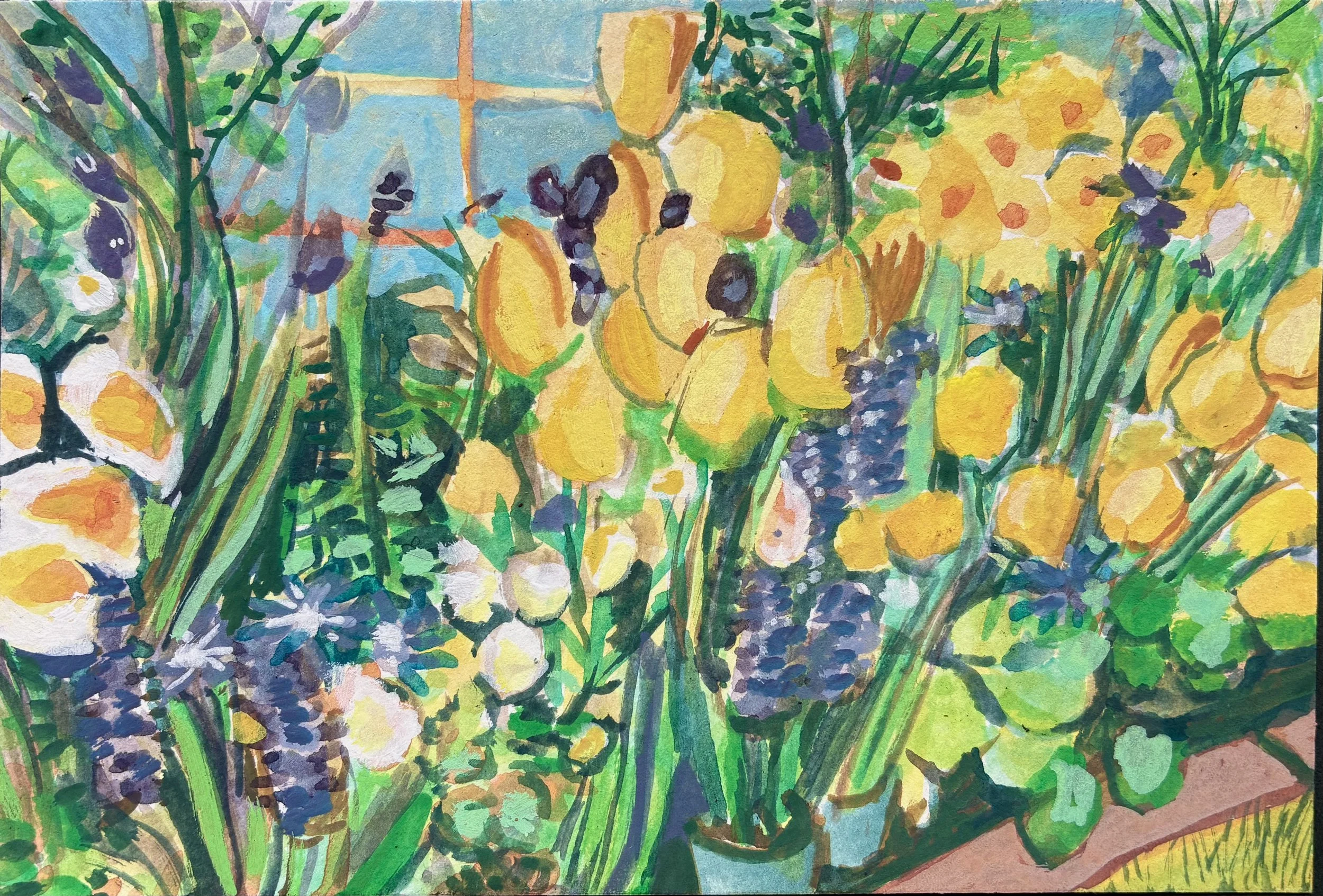 Gouache paintings of the Mount Holyoke College Botanical Garden Bulb Show on paper. 4×6in each. April 2026.